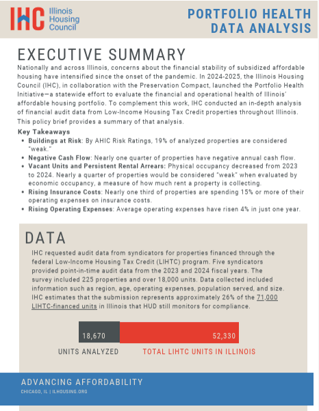Beginning in the summer of 2024, the Illinois Housing Council (IHC), in partnership with the Preservation Compact, launched the Portfolio Health Initiative, a statewide effort to assess the financial and operational health of Illinois’ affordable housing portfolio.